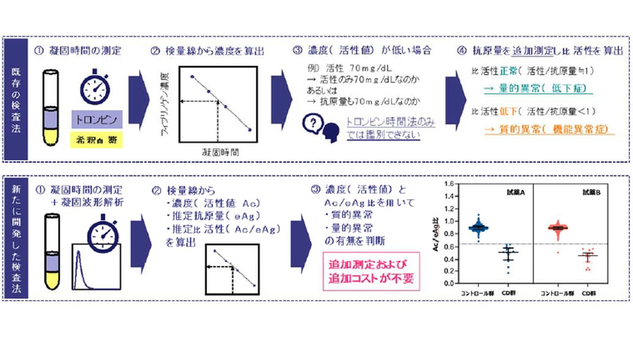 しかし、フィブリノゲン抗原量の測定は、特別な検査試薬が必要であり、追加のコストを要する点や、そもそもフィブリノゲン異常症がまれな疾患である点などから、ごく一部の専門施設でのみ可能な限られた検査となっている。言い換えれば、正確な診断のための検査が広く提供されていないことから、フィブリノゲン異常症の正確な頻度を求めることは困難であると考えられており、実際に見逃されているケースがあるとされている。これらのことから、より簡便にフィブリノゲンの質を評価することができる検査法が求められていた。