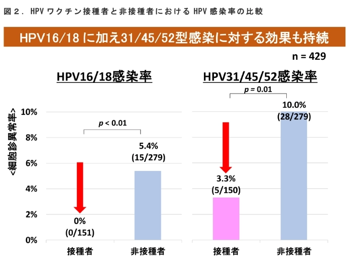 ワクチン接種群とワクチン非接種群におけるHPV感染率を比較した結果では、高リスク型HPVのうち2価ワクチンが標的とする16/18型の感染率は、ワクチン非接種群の5.4%に対してワクチン接種群では0%と有意に低く(P=0.0018)、ワクチンの有効率は100%であることが示された。また、HPV31/45/52型の感染率も、ワクチン非接種群の10.0%に対してワクチン接種群では3.3%と有意に低く(P=0.013)、有効率は69.0%とクロスプロテクション効果も持続していることが示された。
