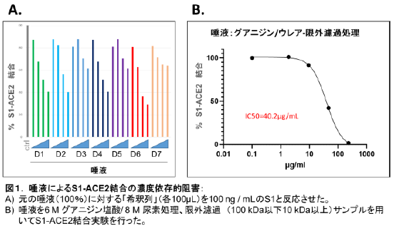 SARS-CoV-2は、ウイルスエンベロープ上のS1がヒト細胞の細胞膜に存在するACE2受容体へ結合することで感染が成立する。研究グループは、SARS-CoV-2-S1とACE2の結合を定量的に測定する実験系(S1-ACE2結合アッセイ系)を作成し、S1-ACE2結合に対する健常者唾液の効果を調べた。その結果、全ての唾液検体(N=7)が濃度依存的に阻害活性を示すことがわかった。
