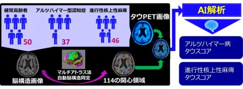 研究グループはこれらの課題を解決すべく、AIを用いて読影と画像解析を自動化し、PET画像のアルツハイマー病らしさを表す「アルツハイマー病タウスコア」と、進行性核上性麻痺らしさを表す「進行性核上性麻痺タウスコア」をそれぞれ算出できるように、認知症の全自動診断に向けた基幹技術の開発を目指した。