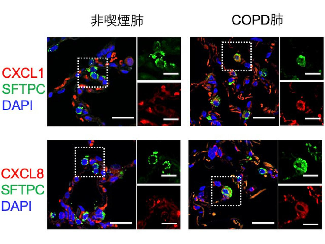 このAT2細胞は、CXCL1、CXCL8などのケモカインを発現することを特徴とすることから、研究グループはinflammatory AT2(iAT2)細胞と命名した。免疫蛍光染色を用いて実際の肺組織での検証を行ったところ、CXCL1、CXCL8などのケモカインと共発現するAT2細胞を認め、iAT2の存在を確認した。また、Gene Expression Omnibus(GEO)に登録されている世界における複数の肺のシングルセルRNA-seqデータを統合・再構築し、同データ内においてもiAT2細胞が存在することを特定したという。