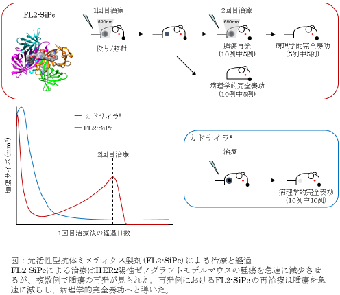 研究グループは、人工的に合成された、製造しやすく腫瘍細胞表面に存在する抗原特異的に結合する抗体ミメティクス薬剤と、人工的に設計された、光を当てると一重項酸素を従来薬より多く作るAx-SiPcを結合させた治療薬「FL2新規ウィンドウを開きます」を開発した。FL2はヒト乳がん細胞に発現しているHER2分子に特異的に結合する。このため、マウス体内へ投与されたFL2はマウスへ移植されたヒト乳がん細胞へ集積する。これまで、マウスにヒト乳がん細胞を移植し成長させ、FL2治療を1回行った場合、肉眼的には腫瘍が消えたように見えても、病理検査ではがん細胞の一部が残存し、5割が再発していた。