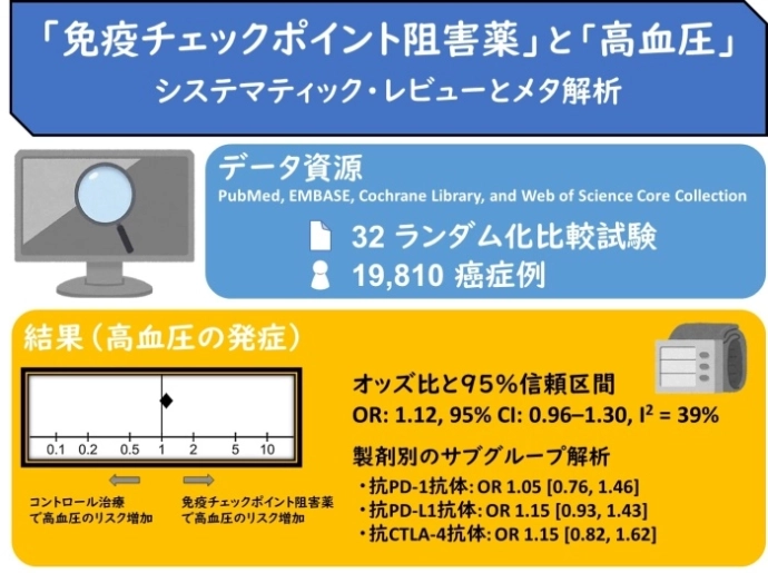横浜市立大学は9月26日、免疫チェックポイント阻害薬(ICI)に伴う高血圧のリスクについて、ランダム化比較試験新規ウィンドウを開きます32件・被験者総数1万9,810例のがん患者を対象としたシステマティック・レビュー(RCT)とメタ解析を行い、免疫チェックポイント阻害薬を開始しても、短期的には血圧が上昇しないことを証明したと発表した。この研究は、同大医学部循環器・腎臓・高血圧内科学の峯岸慎太郎助教、金口翔助教、滋賀医科大学NCD疫学研究センター最先端疫学部門の矢野裕一朗教授、香川大学医学部薬理学の西山成教授らの研究グループによるもの。研究成果は「AHA journal Hypertension」に掲載されている。
