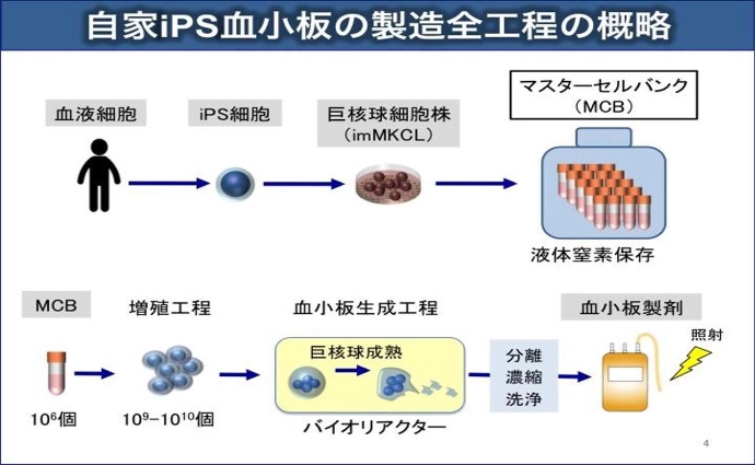 患者から採取した血液細胞からiPS細胞を作製。その細胞から、巨核球細胞株を作り出し、品質が良く安全性に問題がない株を「マスターセル」として凍結保存した。このマスターセルを解凍し、培養液中で巨核球を増殖させた後、「乱流型」のバイオリアクターや新規薬剤を用いて血小板の産生を行った。血小板を分離・濃縮・洗浄した後、放射線照射により増殖できる細胞を根絶させた。