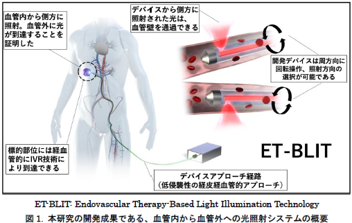 研究グループは、心筋梗塞や脳梗塞治療などの血管内治療で用いられるIVR技術を応用して、デバイスに光照射技術を組み合わせることで、血管内で使用可能な細径光照射デバイス「ET-BLIT」の開発に成功した。