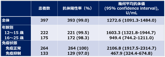 ワクチン2回目接種後の抗体について、全体の99%の患者が陽性だったことがわかった。幾何平均抗体価は、12~15歳が1603.3 U/mL、16~25歳が949.4 U/mLと若年層の方が高く、また、免疫機能が正常な患者は2106.8 U/mL、免疫抑制状態の患者は467.9 U/mLと、免疫正常な患者の方が高い結果だった。