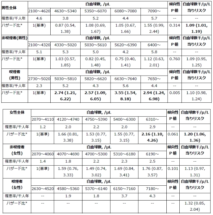 白血球数が1,000/μL増加するごとに、心房細動罹患リスクは集団全体で、12%(非喫煙者で10%、喫煙者で15%)、男性で9%(非喫煙者9%、喫煙者10%)、女性で20%(非喫煙者13%、喫煙者32%)増大していた。
