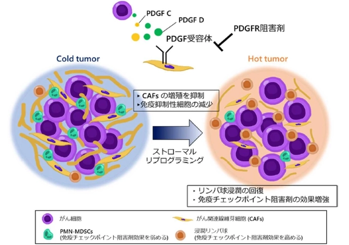 今回の研究により、PDGFR阻害剤によって線維化腫瘍における免疫微小環境を改善する(cold tumor→hot tumor)ことで、免疫細胞の再活性化および免疫チェックポイント阻害剤の効果を促進することが示された。