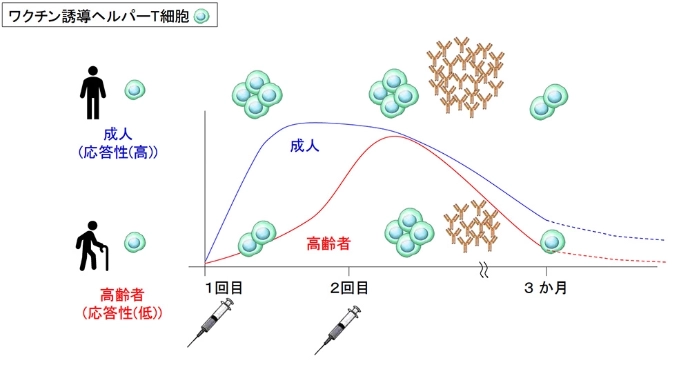 高齢者ではワクチン接種後の抗体価上昇は低く、ヘルパーT細胞応答の立ち上がりが遅い