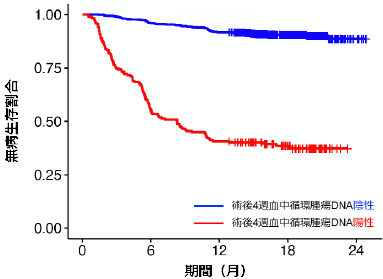 今回の研究は外科治療が行われる大腸がん患者を対象に、国内外約150施設(台湾1施設を含む)の協力を得て行われた世界最大規模の前向き研究である。米国Natera社が開発した高感度遺伝子解析技術「Signatera(シグナテラ)」アッセイを用いて、血中循環腫瘍DNAの測定を行った。生検あるいは手術で採取された腫瘍組織を用いた全エクソーム解析の結果をもとに、16遺伝子を選択して患者オリジナルの遺伝子パネルを作製した。術前および術後4週時点から定期的に血液を採取し、患者毎のオリジナル遺伝子パネル検査を用いて、血液中のがん遺伝子異常の有無を調べた。2020年6月から2021年4月の間に登録された1,563例のうち、十分な臨床情報と血中循環腫瘍DNAの結果が揃っている1,039例を対象に解析を行った。