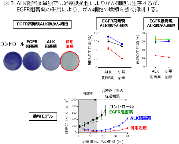 ALK融合遺伝子陽性肺がんのALK阻害薬ロルラチニブの初期治療抵抗性を克服するため、EGFR阻害薬エルロチニブを初期から併用する実験を行ったところ、がん細胞の増殖や生存をより強く抑制することがわかった。さらに、EGFRタンパク質を高発現するALK肺がん細胞ではEGFR阻害薬の併用治療が強く細胞増殖を抑制する一方で、EGFRタンパク質を発現しないALK肺がん細胞ではEGFR阻害薬の併用治療効果は高くないことがわかった。加えて、ALK肺がん細胞を用いた動物モデルの実験においても、ALK阻害薬とEGFR阻害薬の併用治療は強い抗腫瘍効果を示し、腫瘍の増大を有意に抑制した。