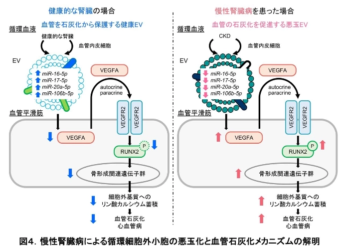 以上から、健康状態では循環EVに豊富に含まれるマイクロRNA群が、血管平滑筋細胞のVEGFA-VEGFR新規ウィンドウを開きます2シグナルを抑制することで、血管が病的石灰化から免れる機構が存在するのに対し、CKDを患った場合は、血液中にマイクロRNA群を枯渇した悪玉EVが多くなり、血管平滑筋の形質転換、石灰化を促進する可能性があるとわかった。
