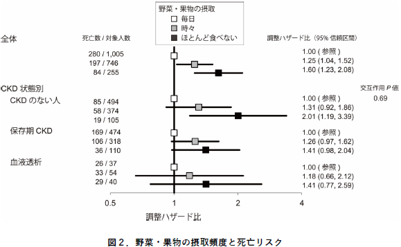 平均5.7年間の追跡調査中に、561人が死亡。野菜・果物の摂取頻度が少ないほど、死亡リスクは増大し、毎日摂取していた人に比べて、時々食べる人は1.25倍(95%信頼区間1.04-1.52)、ほとんど食べない人は1.60倍(95%信頼区間1.23-2.08)だった。CKD状態別に検討を行ったところ、保存期CKDや血液透析の患者群では人数が少なく有意ではなかったが、同様の関連が見られたという。