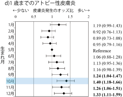 はじめに、生まれた月別の発症状況を比較するため、5月を基準として各生まれ月における湿疹およびアトピー性皮膚炎の出現の調整オッズ比を計算したところ、生後1か月の湿疹では7月生まれで最も高く、生後6か月の湿疹は11月生まれ、1歳の湿疹とアトピー性皮膚炎は10月生まれが最も高くなることがわかった。生後6か月以降で秋生まれの子が湿疹やアトピー性皮膚炎の発症が高いということもわかった。