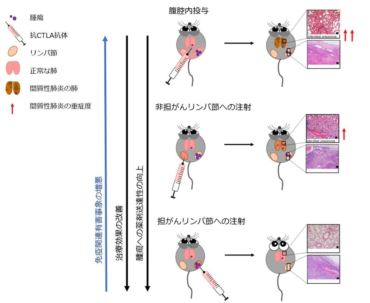 研究グループは、実験的にリンパ節転移と遠隔転移を誘発可能な上記疾患モデルマウスに抗CTLA4抗体(免疫チェックポイント阻害剤として広く使用されている)を用いて、この仮説を検証した。その結果、CTLA4阻害剤を腫瘍が存在するリンパ節に直接投与することで、リンパ節転移および遠隔転移に対する強力な抗腫瘍反応がみられ、マウスの生存期間が延長されることが確認された。このがん免疫療法効果は、腫瘍が存在しているリンパ節および脾臓において活性化したT細胞集団のアップレギュレーションによって媒介された。一方、ICIによる間質性肺炎の重症度は、LDDSによるICI投与群において抑制されていることが確認された。