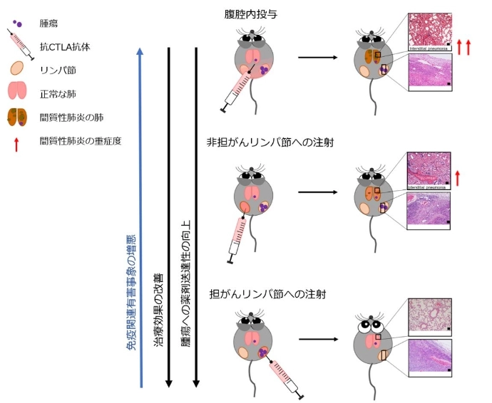 研究グループは、これまで、ヒトと同等の大きさのリンパ節を有するリンパ節転移モデルマウスを用いて、リンパ節を介して薬物をリンパネットワークに送達させるリンパ行性薬物送達法(LDDS)を開発してきた。これらのマウスがICI投与により間質性肺炎などのirAEsを発症することを見出し、世界で初めてICIによるirAEsの疾患モデルマウスを樹立した。