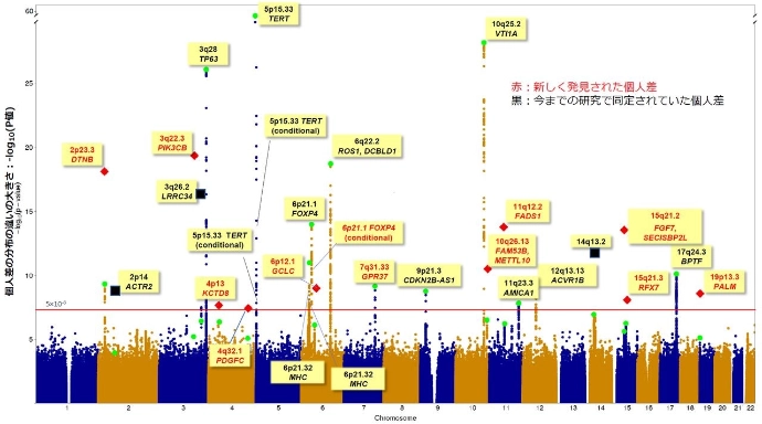 また、肺腺がんの発症には、人種差があることも知られており、非喫煙者における発症頻度が欧米人よりもアジア人で高いことが報告されている。そこで研究グループは米国国立がん研究所が主導する国際共同研究に参画し、肺腺がんへの罹りやすさを決める遺伝子の個人差(遺伝子多型新規ウィンドウを開きます)を網羅的に同定するとともに、欧米人との比較を行った。