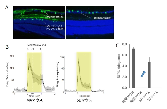 視細胞は失いながらも網膜神経節細胞でのみ光センサーが発現するHtr5b-tTA::tetO-ChR2(5B)マウスと、網膜神経節細胞とスターバーストアマクリン細胞で光センサーが発現するChrm4-tTA::tetO-ChR2(M4)マウスを用いて実験を行ったところ、M4マウスでは5Bマウスにくらべて50%以上の神経の光応答の増強が確認され、5Bマウスでは視力まで回復できなかったのが、M4マウスでは視力を取り戻していることが確認された。