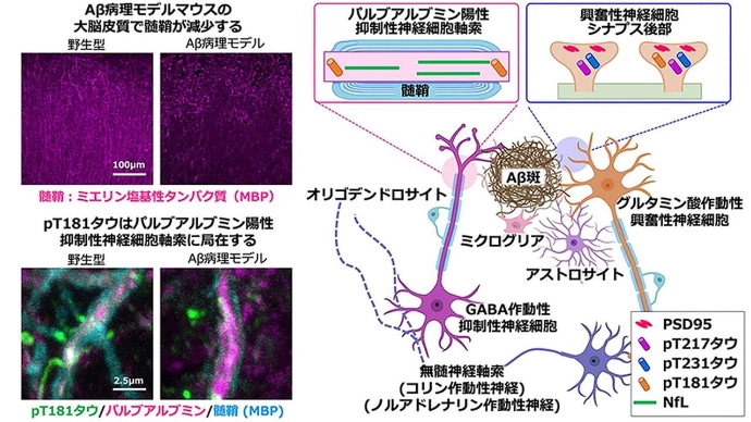 以上の結果から、アルツハイマー病の発症前から検出されるバイオマーカーリン酸化タウタンパク質のpT181タウは、有髄神経であるGABA作動性抑制性神経の軸索変性を反映している可能性が示された。