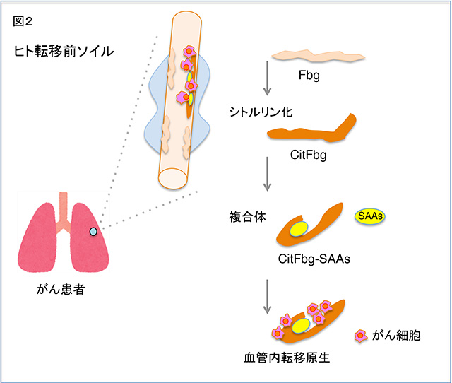 ヒトにおいてシトルリン化フィブリノーゲン-SAAs複合体の集積場所である、転移前ソイルの検出を試みた。ヒトシトルリン化フィブリノーゲン特異的抗体を作製し、がん患者の剖検肺において、限られた場所の血管に複合体沈着を認めた。ヒトにおける転移ソイルの1つの要因として、血管内にシトルリン化フィブリノーゲン-SAAs複合体が形成されると、がん細胞はここを足場として生着し、血管から組織に浸潤して転移を起こすことがわかった。