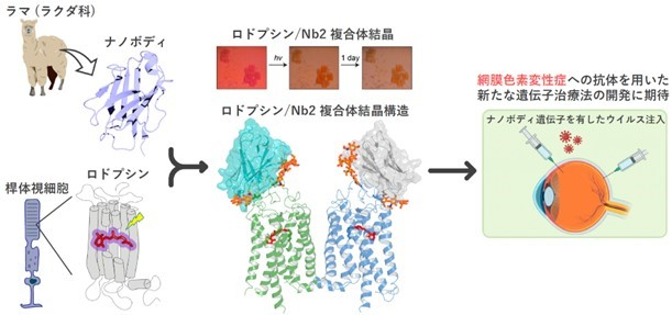 今回、ロドプシンにおいて唯一立体構造が解明されていなかった、メタI中間体様の構造を決定したことで、活性化に至るまでの分子機構の一端が明らかになった。特に、従来、細胞外側におけるレチナールを結合させる部位の変化は、続く光反応過程で情報伝達に重要な細胞質側領域に伝わることが知られていたが、今回の研究によって、細胞外側領域に存在する自由度の高いループ構造がアロステリックに細胞質側領域の大きな構造変化を制御していることが示唆された。これによって、GPCRを標的とした創薬研究に新たな設計指針を与えることが期待される。また、今回の研究対象であるナノボディ低分子抗体は、分子量が小さく、安定で可溶性であることから、通常の抗体が一般に接近できないエピトープ(抗原内で抗体が結合する部位)を認識でき、通常の抗体に代わる有望な抗体治療薬として注目されている。実際に、研究グループは、ナノボディ低分子抗体を遺伝学的に、網膜色素変性症モデル動物マウスに導入する研究を開始しており、桿体視細胞の細胞死抑制や視力改善について、評価をしていく予定である。「研究成果により、いまだ治療法が確立していない網膜色素変性症の遺伝子治療を可能にすることが期待される」と、研究グループは述べている。(QLifePro編集部新規ウィンドウを開きます)