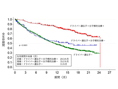 さらに、ドライバー遺伝子変異の有無と標的治療の有無に分類して、患者の生存期間を比較した。(1)遺伝子検査の結果、ドライバー遺伝子が見つかり分子標的治療を受けた患者、(2)遺伝子検査の結果、ドライバー遺伝子が見つかったが対応する分子標的治療薬を受けられなかった患者、(3)検査の有無に関わらずドライバー遺伝子が見つからなかった患者の生存期間を解析したところ、患者の生存期間中央値はそれぞれ(1)24.3か月、(2)15.2か月、(3)11.0か月だった。