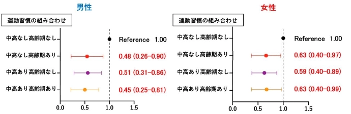 その結果、中学・高校生期と高齢期の両方で運動習慣を有する人では両時期で運動習慣を有さない人に比べてMCIのオッズ比が0.62倍低いことが示された。また、中学・高校生期のみ、高齢期のみ、あるいは両時期に運動習慣を有する人では両時期で運動習慣を有さない人に比べて老年期うつ症状のオッズ比が男女とも低いことが示された。具体的には、男性では、中高なし高齢期あり群オッズ比0.48、中高あり高齢期なし群オッズ比0.51、中高あり高齢期あり群オッズ比0.45、女性では中高なし高齢期あり群オッズ比0.63、中高あり高齢期なし群オッズ比0.59、中高あり高齢期あり群オッズ比0.63だった。