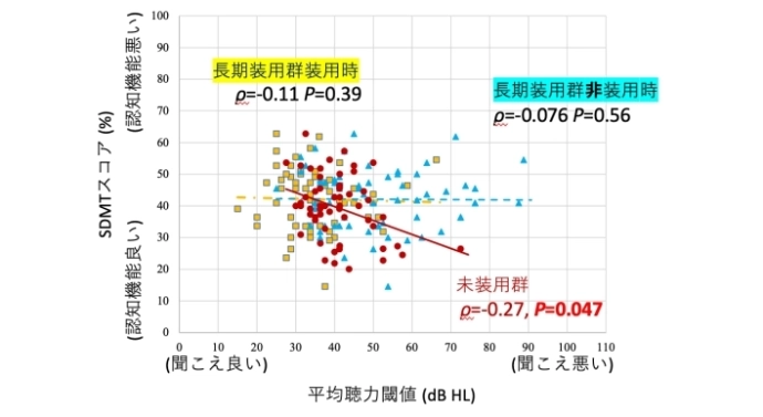 良聴耳(平均聴力閾値が小さい方の耳)の平均聴力閾値と認知機能検査の関係において、補聴器の未装用群では、平均聴力閾値と認知機能検査であるSDMTスコアの間に有意な負の相関関係を認めた。一方、長期装用群では、補聴器非装用時あるいは補聴器装用時に関わらず、平均聴力閾値とSDMTスコアの間に有意な相関関係は認められなかった。