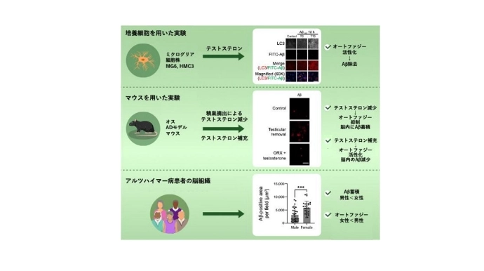 今回の研究では、脳内の免疫細胞であるミクログリアに着目。ADの病態の特徴の一つである、アミロイドβ(Aβ)の蓄積は、神経細胞にとって有害なストレスとなる。正常なミクログリアはAβなどの異常タンパク質を貪食・分解し、脳の恒常性を維持する。しかし、Aβの異常な凝集・蓄積が起こると、ミクログリアが正常に機能できず、不要なタンパク質の除去過程が阻害され、脳内の慢性炎症、ひいては神経細胞死が引き起こされる。この過程に性差があれば、それがAD発症の性差となって表れる可能性がある。ミクログリアのAβ処理機構の1つとして、オートファジーが関与していることが報告されている。オートファジーは、細胞内の不要なタンパク質や細胞成分を分解する機能のことである。今回の研究では、ミクログリアのオートファジー制御におけるテストステロンの役割を解析した。