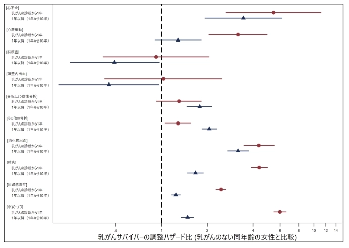 観察期間を乳がんの診断から1年以内、1年以降(1年から10年)に区切って解析すると、多くの疾患は乳がんの診断から1年以内のハザード比が、それ以降のハザード比よりも高いという結果だった。例えば、不安・うつでは1年以内のハザード比が5.98倍、それ以降が1.48倍だった。