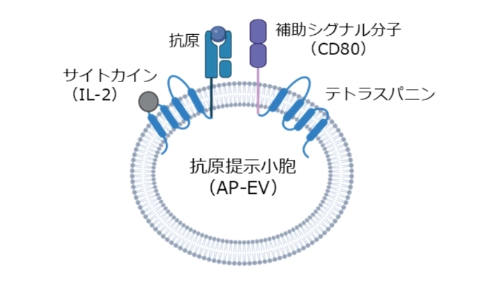 今回の研究では、エクソソームを人工的に改変し、がん細胞を攻撃するキラーT細胞を選択的に増強する「改変エクソソーム」を開発した。キラーT細胞の増強には、T細胞受容体(TCR)を介した抗原刺激、補助シグナル分子の活性化、サイトカイン(IL-2)というT細胞の増殖を促進するサイトカインが重要だ。この要素をエクソソームに組み込むため、テトラスパニンという4回膜貫通タンパク質を足場として利用し、それらの分子を融合させた改変エクソソームを作製した。このエクソソームは、抗原を提示する能力を持つことから、「抗原提示小胞(Antigen-Presenting Extracellular Vesicles、AP-EV)」と名付けられた。