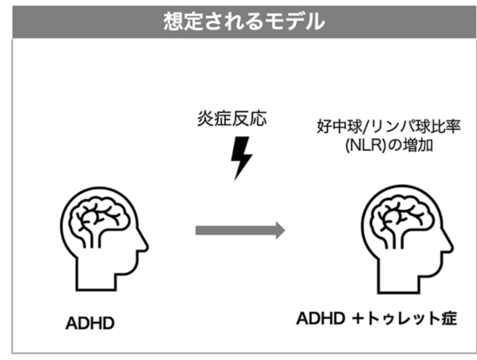 炎症の程度を反映するとされる血液中の好中球とリンパ球の比率(Neutrophil-Lymphocyte Ratio: NLR)を比較したところ、ADHDとトゥレット症の両方を有するグループでは、ADHDのみのグループと比べて有意に高いNLR値が示された。この結果は、トゥレット症の発症に、炎症が関与している可能性を支持するものであり、NLRが今後の新たなバイオマーカー候補となる可能性を示唆している。