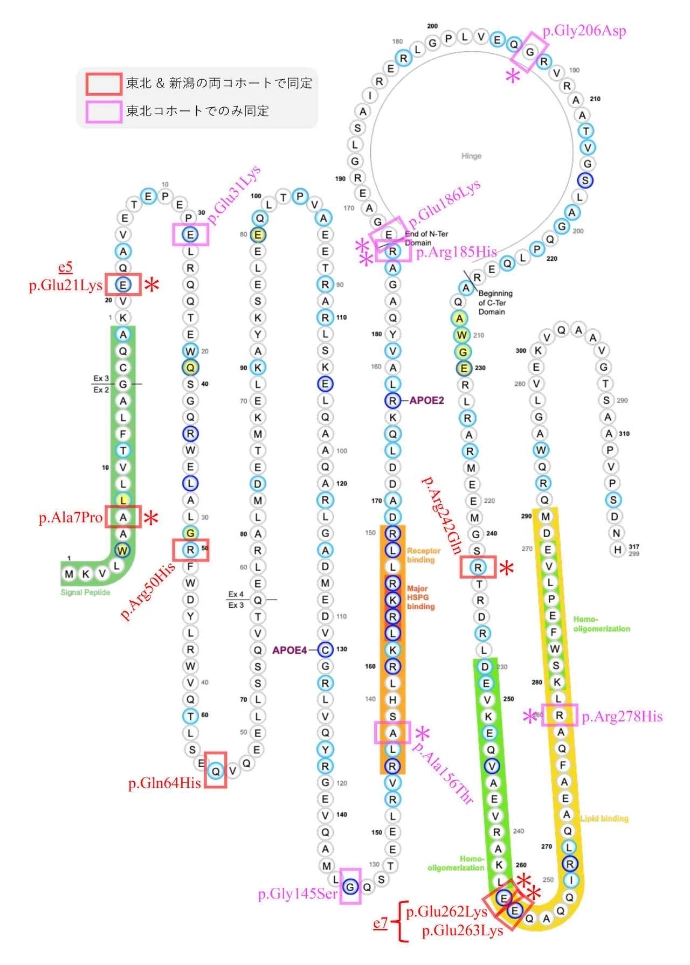 14個のAPOE RMVsを同定した(マイナーアリル頻度=0.02~0.73%)。そのうち「rs140808909(p.Glu262Lys)」と「rs190853081(p.Glu263Lys)」の2個は隣接して存在し、APOEのコモンミスセンスアリルの1つであるe3アリルを背景として、完全連鎖不平衡(r2=1)の関係、すなわち、一方の塩基(ヌクレオチド)が決まるともう一方が必然的に決まる関係にあることがわかった。この組み合わせ(ハプロタイプ)は、過去に日本人によって脂質異常症との関連で「e7アリル」として報告されていた。