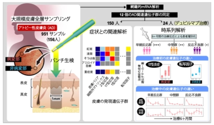 今回の研究では、156人のAD患者から病変部および非病変部皮膚を対象に、直径1mmの全層パンチ生検で951検体を採取した。これらの皮膚組織でRNAシークエンシング(RNA-seq)を行い、遺伝子の発現パターンを網羅的に解析した。横断解析では、皮膚のさまざまな症状と関連する分子動態の特徴を明らかにし、縦断解析では、デュピルマブ治療を6か月間受けた24人の患者における、治療反応と関連する皮膚の分子プロファイルの変化を追跡した。