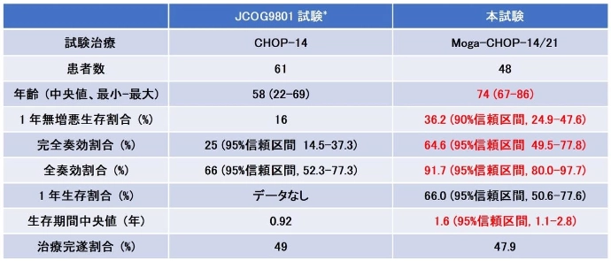 その結果Moga-CHOP療法(Moga-CHOP-14/21)は、高齢者を対象としたにもかかわらず、過去に若年者を対象に実施されたCHOP-14療法を上回る治療成績が得られた。主な有害事象としては、血球減少、感染、皮疹などが認められた。