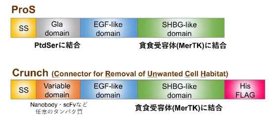 この新しい改変タンパク質は、「クランチ(Crunch:Connector for Removal of Unwanted Cell Habitat)」と命名された。クランチは、標的細胞に結合する「標的認識部位」、構造安定性を高める「EGF様ドメイン」、貪食受容体(MerTKなど)に結合する「SHBG様ドメイン」の3つの機能モジュールから構成され、不要な細胞と貪食細胞を橋渡しするとともに、貪食シグナルを活性化する役割を果たす。