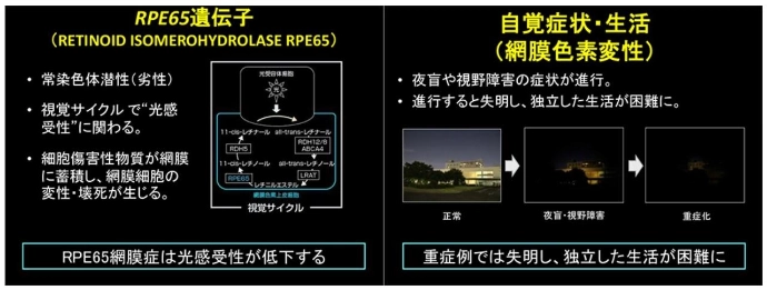 RPE65網膜症は、先天性夜盲や視力低下・視野狭窄を呈するまれな疾患で、その原因はRPE65遺伝子の機能喪失である。進行性で、20代までに社会生活が困難となる症例も多く、これまで有効な治療法はなかった。