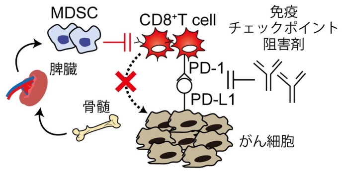 MDSCは、PD-1/PD-L1以外の経路によって腫瘍組織内の免疫抑制環境を形成させ、抗腫瘍免疫を抑えることで免疫チェックポイント阻害剤の治療抵抗性やがん疾患の増悪に寄与している。MDSCは骨髄で産生された後、二次リンパ組織であり免疫細胞のリザーバーである脾臓から血液を介して腫瘍組織へと供給される。腫瘍存在下においては生体で慢性的な炎症環境が形成されることにより、MDSCの分化、遊走が促進され、脾臓に貯蓄される。このMDSCの組織間のクロストークによって、MDSCが腫瘍組織内に浸潤し、抗腫瘍免疫が抑制されると考えられている。
