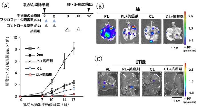多様なマクロファージがある中で、研究グループは乳腺組織に常在するマクロファージが乳がん細胞の増殖の初期段階を手助けしていることを見いだし、がん細胞には作用しないマクロファージ阻害薬(CL)を用いて、乳腺に常在するマクロファージを死滅させたところ、TNBC増殖が顕著に抑制された。この実験結果をもとに、TNBCの術後再発および転移に対するマクロファージ阻害の影響を検討した。具体的には、まずマウスの乳房にTNBC細胞を移植後、腫瘍の大きさが1cmに達したとき、その95%を切除し、乳がんの再発モデルとした。そのモデル(各治療群8匹)を用いてTNBCの増殖および他の臓器の転移におけるマクロファージ阻害の効果を検討したところ、マクロファージ阻害によって、TNBCの増殖および肺や肝臓への遠隔転移が顕著に抑えられることがわかった。さらに、汎用されている抗がん剤と併用して、マクロファージとがん細胞を同時に攻撃したところ、さらなる抑制効果が観察された。