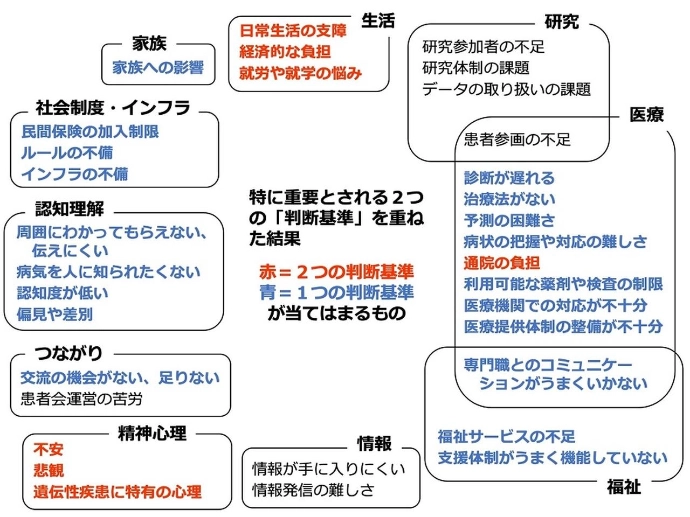 特に、今回の研究で対象とした希少疾患領域では、一部の、個々の患者会による陳情型で意見を伝えることに留まっており、患者会をもたない疾病の患者や、患者会活動が活発ではない疾病の患者の声も含め、希少疾患領域の政策に、より客観的な形で患者の声を反映させることが課題となっている。